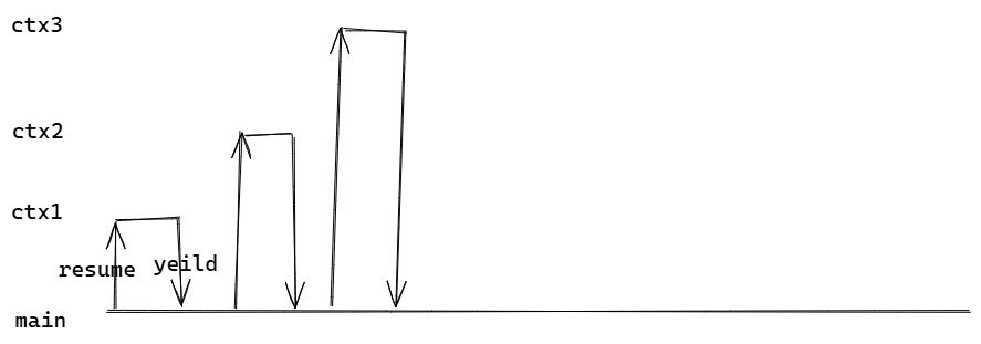这里通过一张图来解释下面的使用ucontext来进行协程运作的代码,每个协程通过跳转到统一的调度器main_ctx中重新对其进行调度来实现并行运作。一个resume代表恢复到某个协程,yield代表让步本资源,回到调度器中等待重新调度,这两个原语过程看作一个switch。